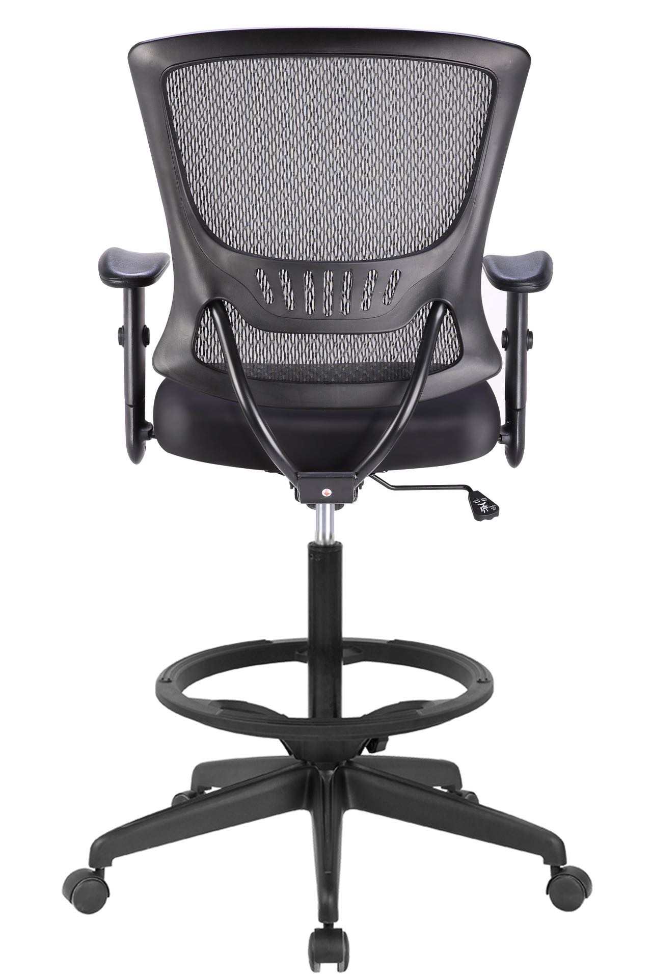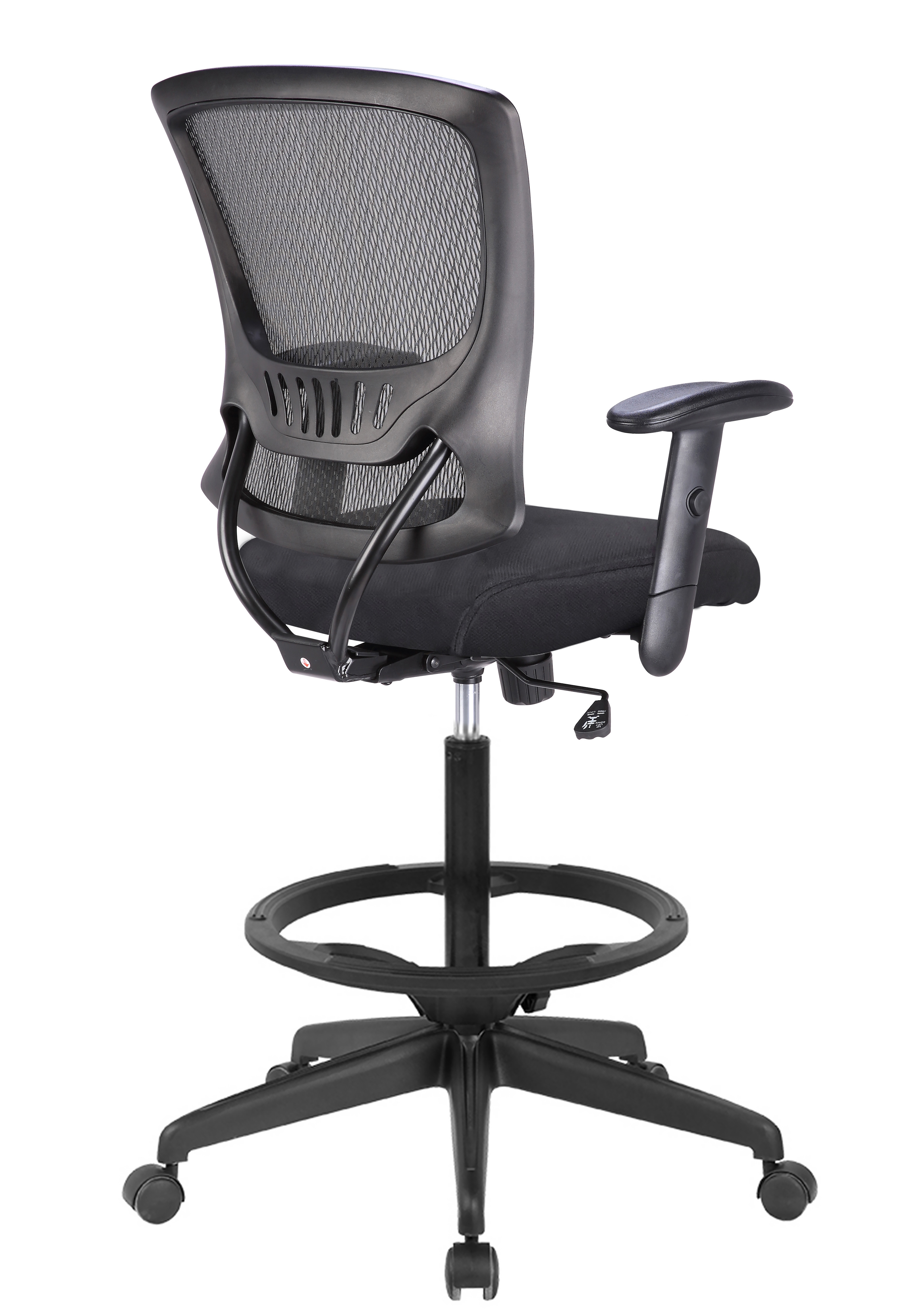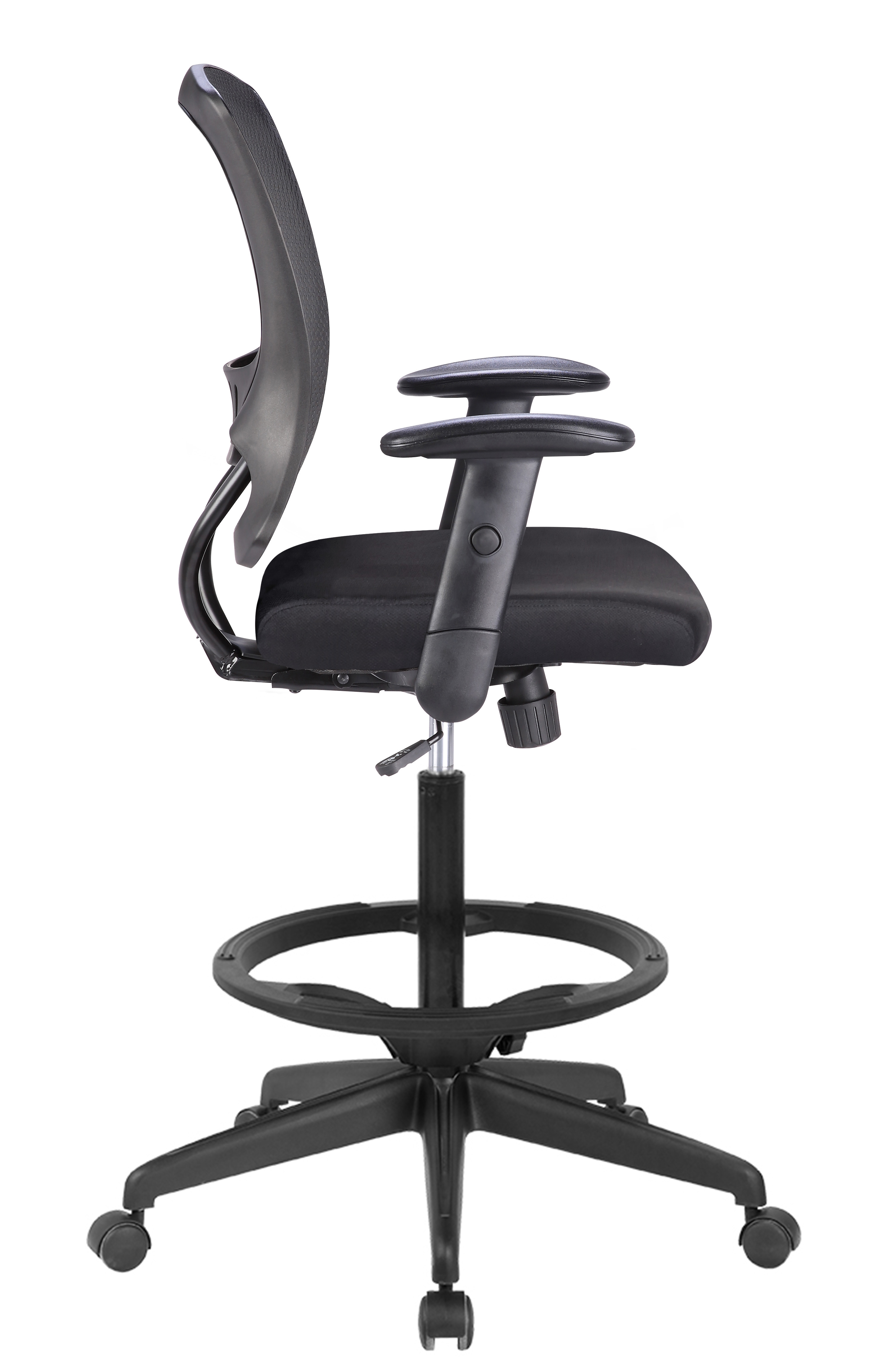 The Aero stool is a perfect fit for higher work surfaces. Thick, padded stain resistant upholstered seat cushion, Built-in lumbar support, padded arm rests and heavy duty, oversized carpet casters and adjustable Chrome foot ring.