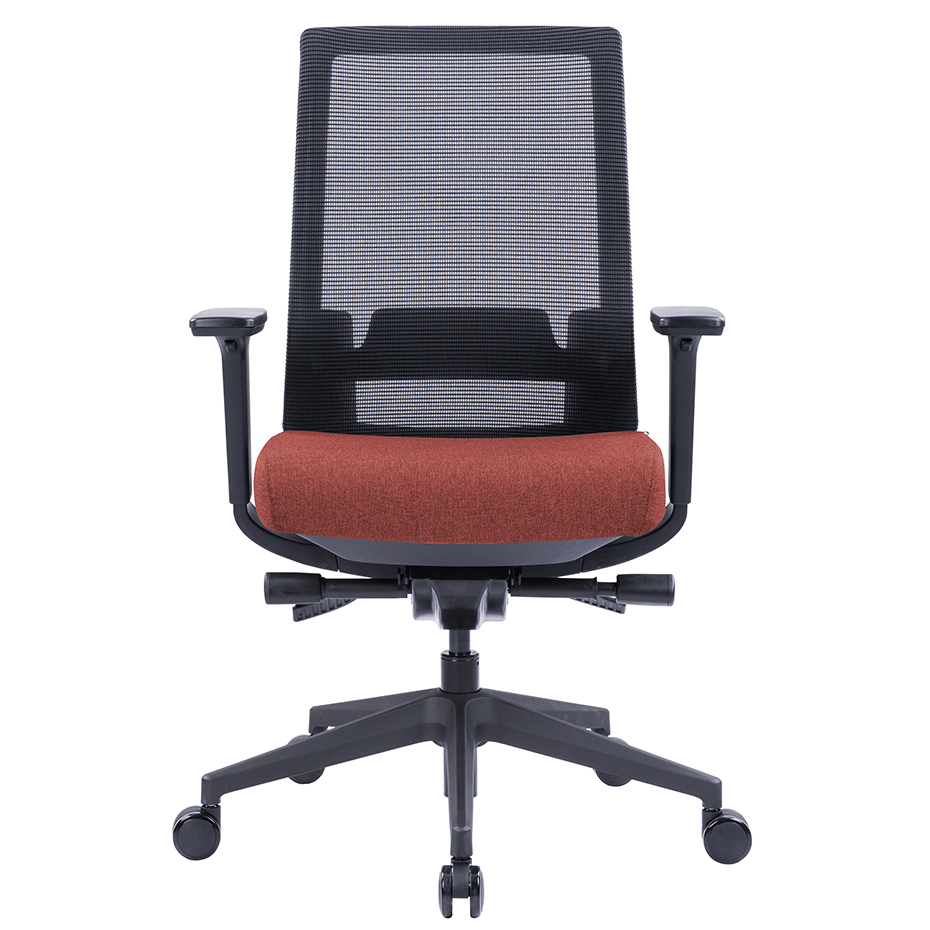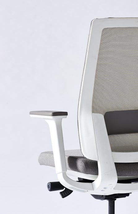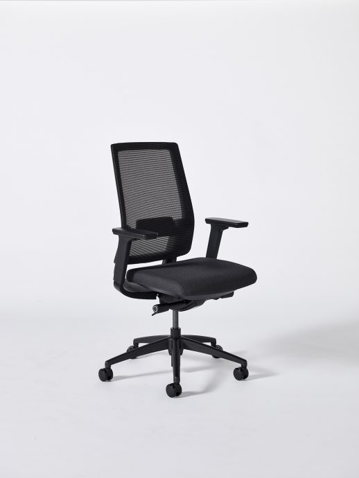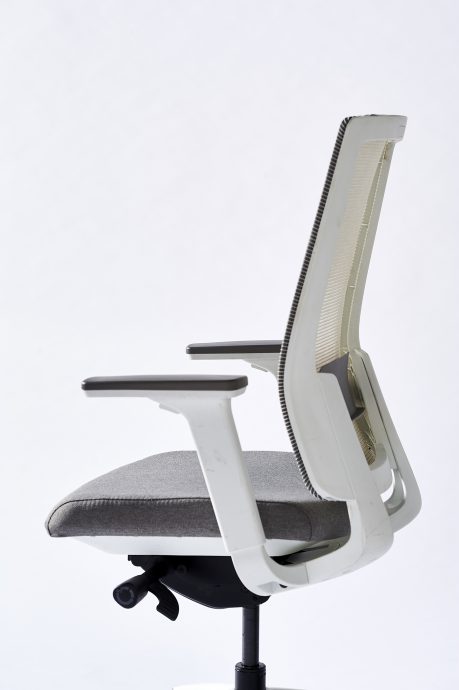 Mesh back, upholstered seat, pivoting height adjustable arms, and a seat slider.
